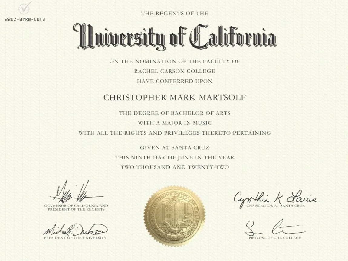 After graduation and meeting my wife Dalia, I moved up to the East Bay to pursue my passion. While working in live sound as a stagehand for Live Nation, and I was fortunate enough to find an amazing circle of musicians at ModernTone Studios, based in Lafayette. The owner and lead engineer, Jacob Light, took me on as an assistant after seeing my desire and love to make music with others. I am now an audio engineer recording local artists, podcasters, choirs, bands, and more. I also found a love for teaching, where I offer lessons in Drums, Piano, and Music Production.